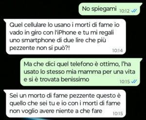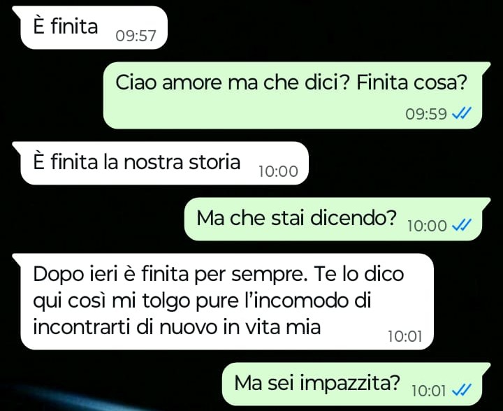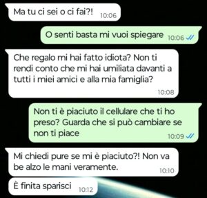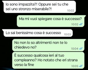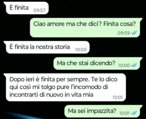 “Ciao Spunte Blu sono un ragazzo di 26 anni e oggi ho deciso di mandarvi una chat che ho avuto con la mia ragazza che da questo momento in poi penso che sarà solo una ex ragazza. Io e lei ci siamo messi insieme otto mesi fa e in questi mesi io ho perso davvero la testa perché mi piaceva tantissimo anche se ho sempre riconosciuto fin dal primo giorno il fatto che nonostante mille pregi e qualità lei è anche molto snob e superba.. per farvela breve era una ragazza fantastica per me solo un po’ altezzosa. Ieri però abbiamo festeggiato il suo compleanno insieme agli amici e alla sua famiglia e stamattina mi scrive per dirmi che tra noi due è finita per sempre. All’indomani del suo primo compleanno festeggiato insieme a me mi scrive una cosa del genere dal nulla. Se leggete la chat che ho mandato rimarrete veramente senza parole come lo sono io adesso…”