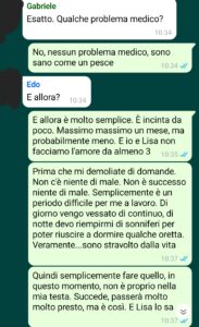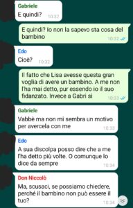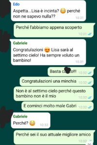 “Quella che state per leggere è la conversazione che, nel bene e nel male, ha cambiato per sempre la mia vita. All’inizio non volevo condividerla ma poi mi sono detto: “perché no?”. C’è veramente troppo di cui parlare relativamente ad essa e quindi mi sono sentito in dovere di farlo. Mi presento: mi chiamo Matteo, sono un ragazzo come tanti, un uomo direbbe mia madre, e da qualche anno sto con Lisa che, senza dubbio, è la persona che amo di più al mondo. Viviamo insieme, abbiamo una vita normale, come tutti, ma siamo felici. Siamo felici, nonostante l’ultimo periodo sia stato davvero duro e complicato. Per me soprattutto. Il lavoro mi sfianca, sono sempre stremato, e ho la testa da un’altra parte. Penso sia normale, capita a tutti, però questo mi ha reso un po’ più distante e il tutto si è riversato sulla coppia. Ma il punto non è questo. Poco tempo fa, Lisa mi ha annunciato di essere incinta ed era felice. Ma io, per ragioni che leggerete, non potevo essere il padre. Allora ho creato un gruppo con i principali “sospettati” perché dovevo scoprire la verità.”