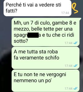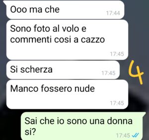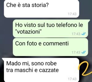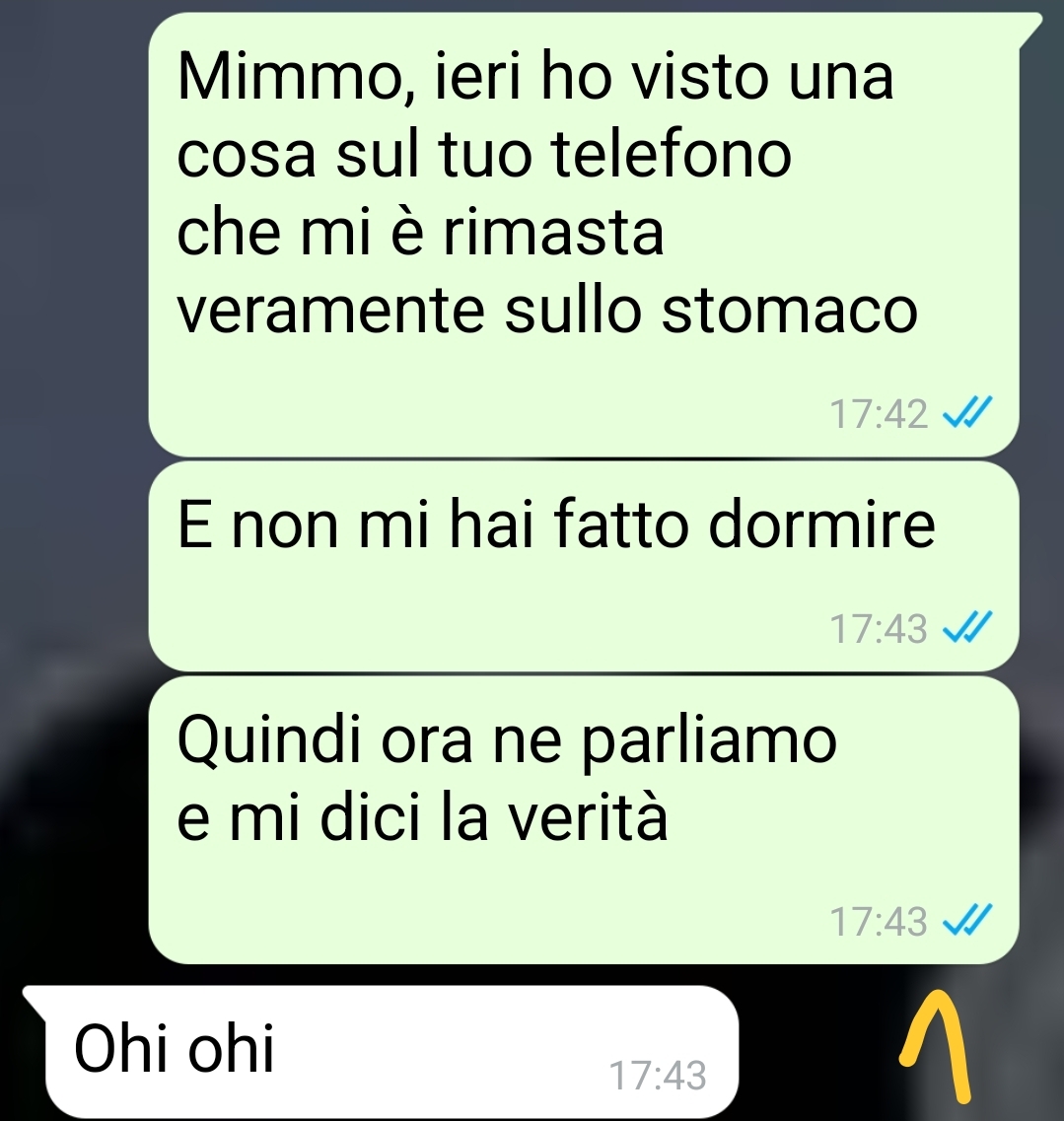 “Vi è mai capitato di scoprire qualcosa che non è tradimento, non è flirta, non è niente “di grave”… ma vi fa schifo proprio dentro? A me sì, e ancora oggi non so se ridere o piangere per quanto mi sono sentita stupida. Io e Mimmo stavamo insieme da qualche mese, una cosa fresca, leggera, tutto ok. Finché una sera, cercando una foto sul suo telefono, mi scende una notifica da un gruppo chiamato “Lista Spesa ”. Già mi stava venendo da ridere, poi leggo l’anteprima: “Quella coi pantaloni beige è minimo un 7 di culo ”. Vi giuro mi si è gelato qualcosa nello stomaco. Non lo so, ditemi voi se sono esagerata però eccovi la chat”