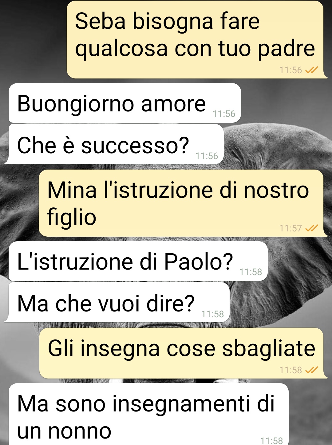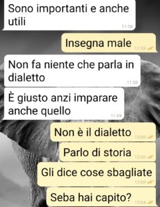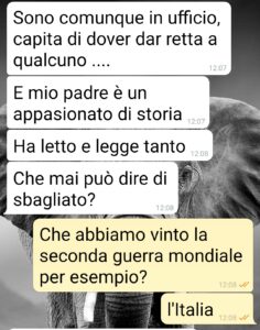 Leggetevi questa chat che ho avuto con mio marito . C’è qualche madre che non interverrebbe? Non credo proprio. Chi sopporterebbe di avere il figlio che difende falese versioni della storia? E prima che mi linciate, socialmente parlando, non mi piace la soluzione estrema. Serve da sprone. Almeno spero. E fatela voi un’ora di chat del genere senza incappare in errori o litigare continuamente col T9. Giusto per i professoroni della crusca che sicuro accoreranno come avvoltoi. Comunque mio suocero ha 85 anni e vive con noi da quando è rimasto vedovo. Mio marito è l’ultimo figlio, quello inatteso, con la seconda moglie, avuto tipo a 45 anni. Dire che è arzillo è poco . Buon per lui. È anche affettuoso e disponibile con Paolo, nostro figlio, che lo venera come un maestro, tipo Gandalf. Ed è diventato un problema il fatto che “insegna” storia e altro a Paolo. Perché insegna cose errate, per non dire false. Leggete per farvi l’idea”