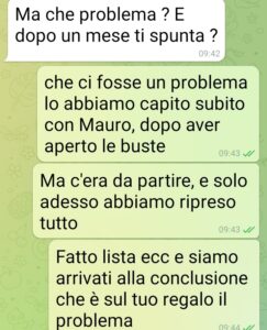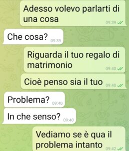 “Ho ricevuto un regalo di matrimonio sbagliato. Una classica busta di auguri con soldi annessi. Che però non conteneva soldi e nemmeno auguri. C’era una lettera ma indirizzata non di certo a due sposini. Con mio marito ci siamo sorpresi quando l’abbiamo trovata in mezzo alle altre. Ma abbiamo potuto ragionarci sopra solo dopo essere tornati dalla luna di miele. E, abbinando regali e invitati, quello che mancava era di Gaia e suo marito. Gaia è una mia cara amica del liceo. Ero sicura che mi avessero portato una busta regalo. E in questa lettera che ho trovato c’è la firma di Giacomo. Ok che ne avevo 3 di Giacomo al matrimonio… ma lui è l’unico che manca all’appello regali. Scrivo a Giada per approfondire la questione. Sapendo bene che, se i miei sospetti sono fondati, non sarà una discussione semplice. Come si è svolta e come è finita (e come ha reagito…) lo vedrete dagli screen che vi allego. Non so se fare altro e cosa… qualche suggerimento?”