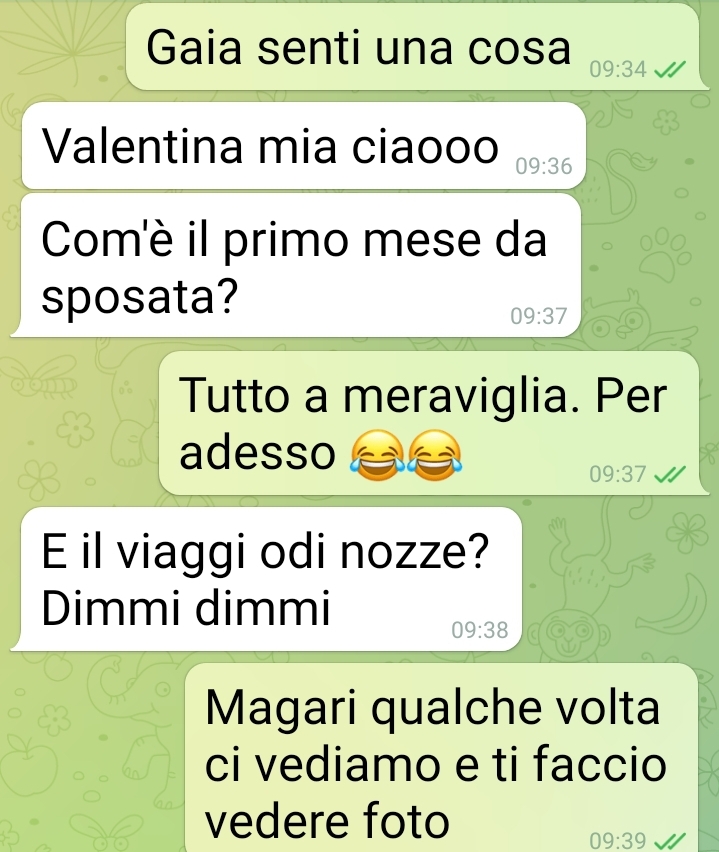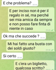 “Ho ricevuto un regalo di matrimonio sbagliato. Una classica busta di auguri con soldi annessi. Che però non conteneva soldi e nemmeno auguri. C’era una lettera ma indirizzata non di certo a due sposini. Con mio marito ci siamo sorpresi quando l’abbiamo trovata in mezzo alle altre. Ma abbiamo potuto ragionarci sopra solo dopo essere tornati dalla luna di miele. E, abbinando regali e invitati, quello che mancava era di Gaia e suo marito. Gaia è una mia cara amica del liceo. Ero sicura che mi avessero portato una busta regalo. E in questa lettera che ho trovato c’è la firma di Giacomo. Ok che ne avevo 3 di Giacomo al matrimonio… ma lui è l’unico che manca all’appello regali. Scrivo a Giada per approfondire la questione. Sapendo bene che, se i miei sospetti sono fondati, non sarà una discussione semplice. Come si è svolta e come è finita (e come ha reagito…) lo vedrete dagli screen che vi allego. Non so se fare altro e cosa… qualche suggerimento?”