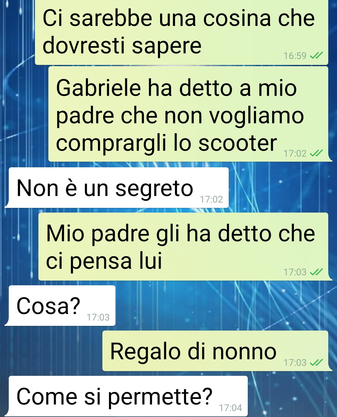 Ciao pagina di spunte, sono una moglie e una mamma e vorrei far cambiare opinione a mio marito circa lo scooter. Nostro figlio Gabriele ci ha detto che gli piacerebbe molto averne uno. E già che l’ha posta in questo modo dovrebbe farvi capire di che ragazzino d’oro stiamo parlando. Non parlo con cuore di mamma, è davvero bravo, posato e obbediente. Mai un problema e mai una richiesta o una pretesa. Mai. Per farvi capire di essere imparziale: la femminuccia, che di anni ne ha 9, è molto diversa…molto.  Quindi vorrei accontentarlo in questo desiderio. Perché veramente se lo merita e merita fiducia. Capisco mio marito e le sue preoccupazioni. Capisco anche il peso che il suo passato ha nella sua visione. Mi preoccupa però un NO adesso e in queste circostanze a Gabriele. Qualcuno che ci è passato e ha consigli? Grazie a tutti.”