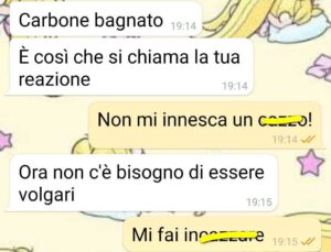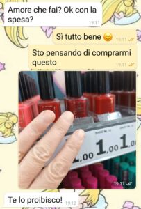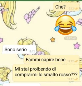 Vi mando la chat col mio fidanzato. Ero al supermercato a fare la spesa e lui mi scrive. Mi ha chiesto cosa stessi facendo, cosa che fa abbastanza spesso da un anno a questa parte. Ma ok, va bene, è tollerabile. Io avevo visto degli smalti rossi, una cosa da supermercato, niente di bellissimo, ma mi era piaciuto un sacco il tono di rosso e ingenuamente ho mandato una foto al mio ragazzo. Quello mi ha risposto che mi proibiva di comprare quello smalto e di indossarlo. Ora io credevo di essere nel 2026, ma evidentemenente il mio ragazzo aveva una deLorean senza dirmelo e ha impostato l anno 1469 e siamo andati indietro nel tempo col flusso canalizzatore. Ora io scherzo , ma la cosa mi ha dato un sacco fastidio.