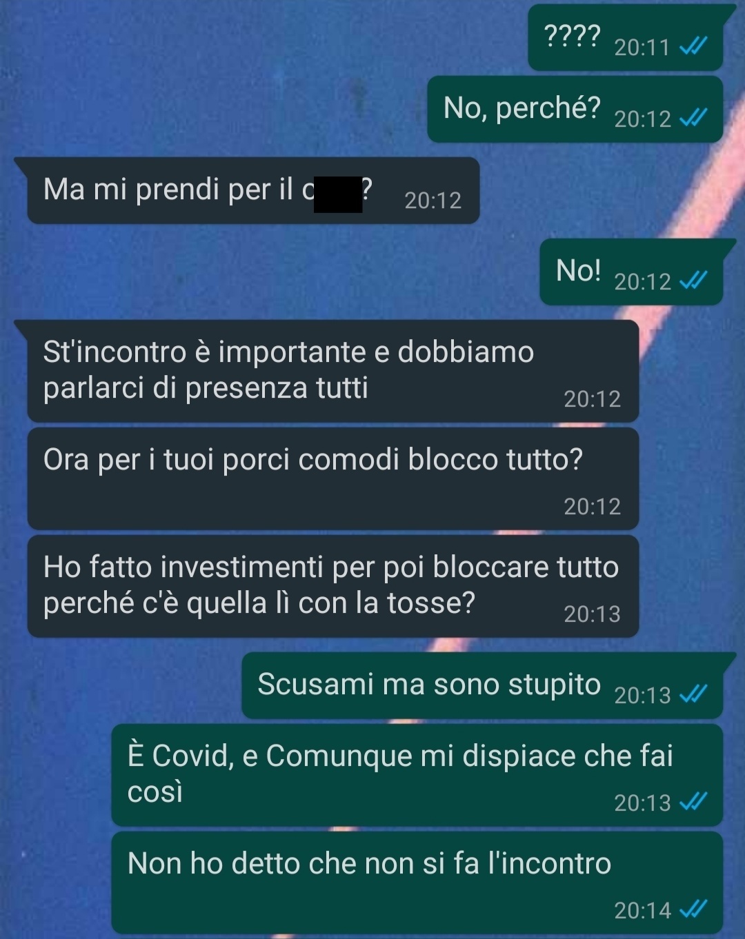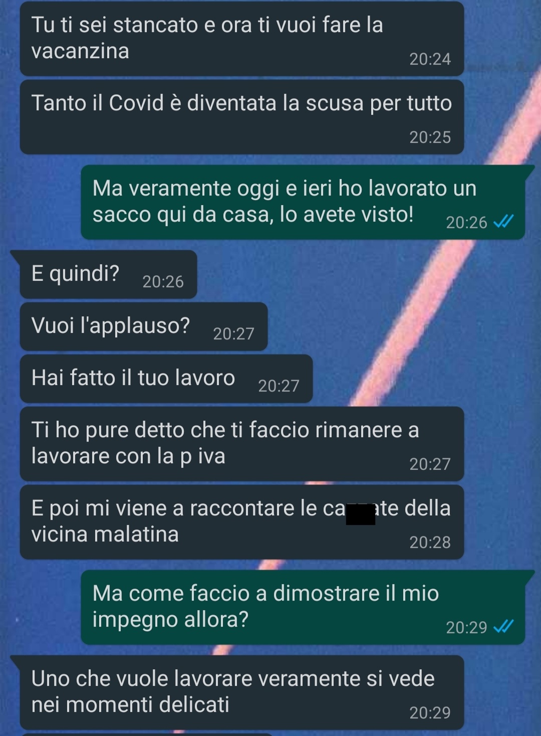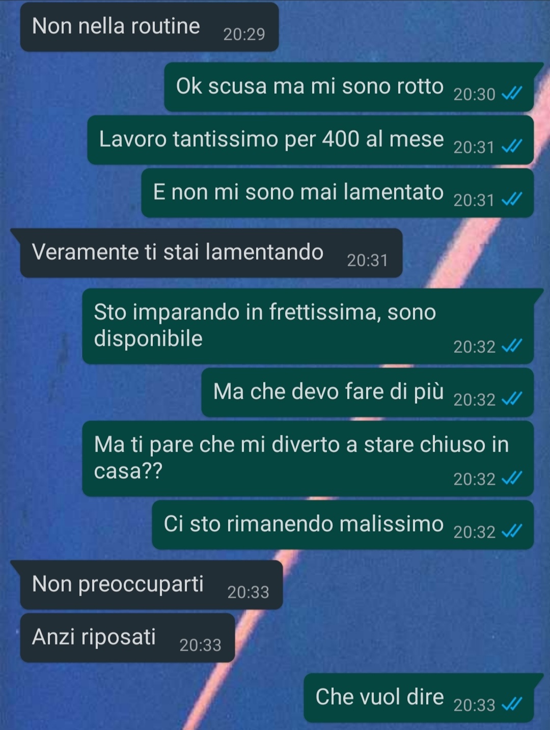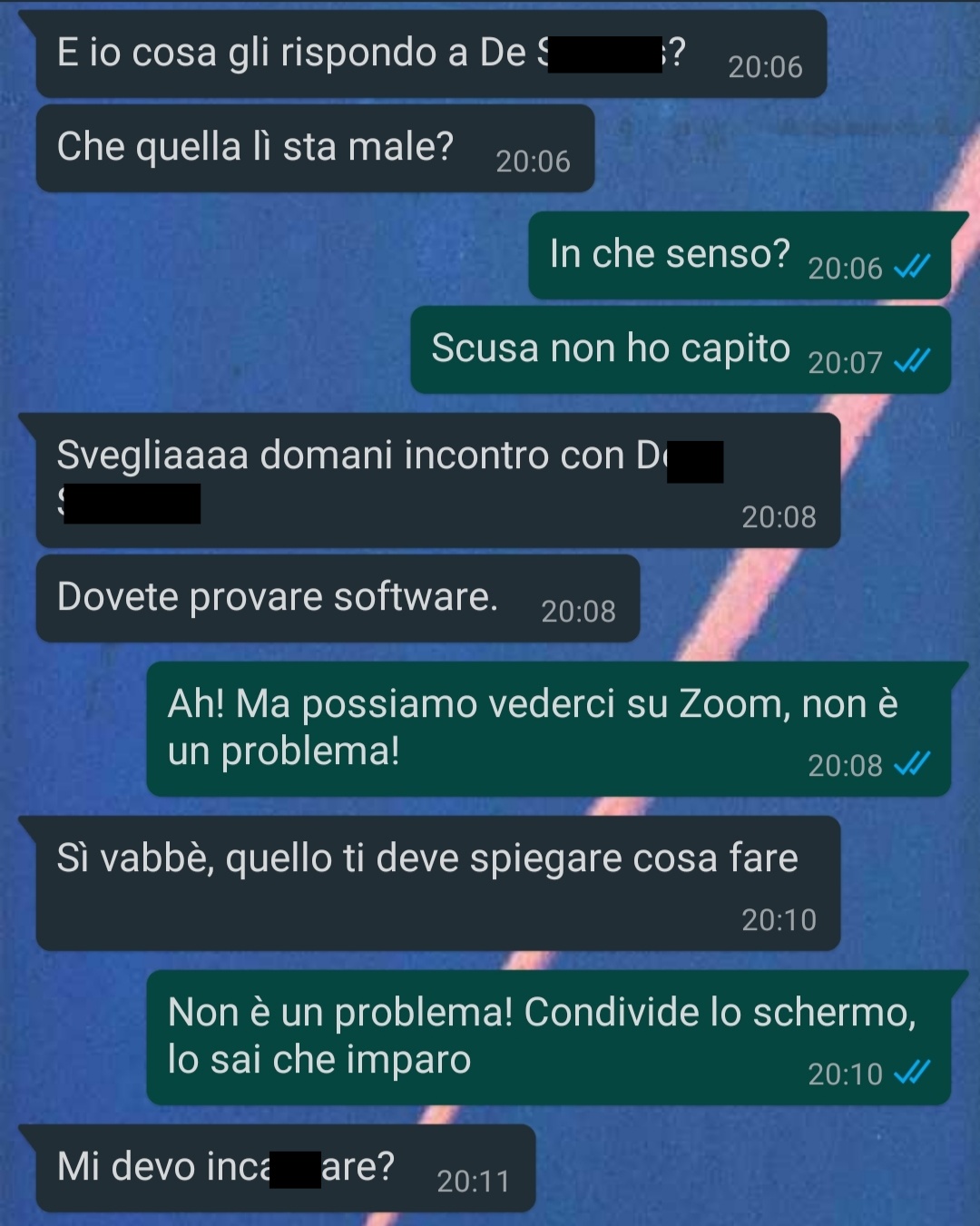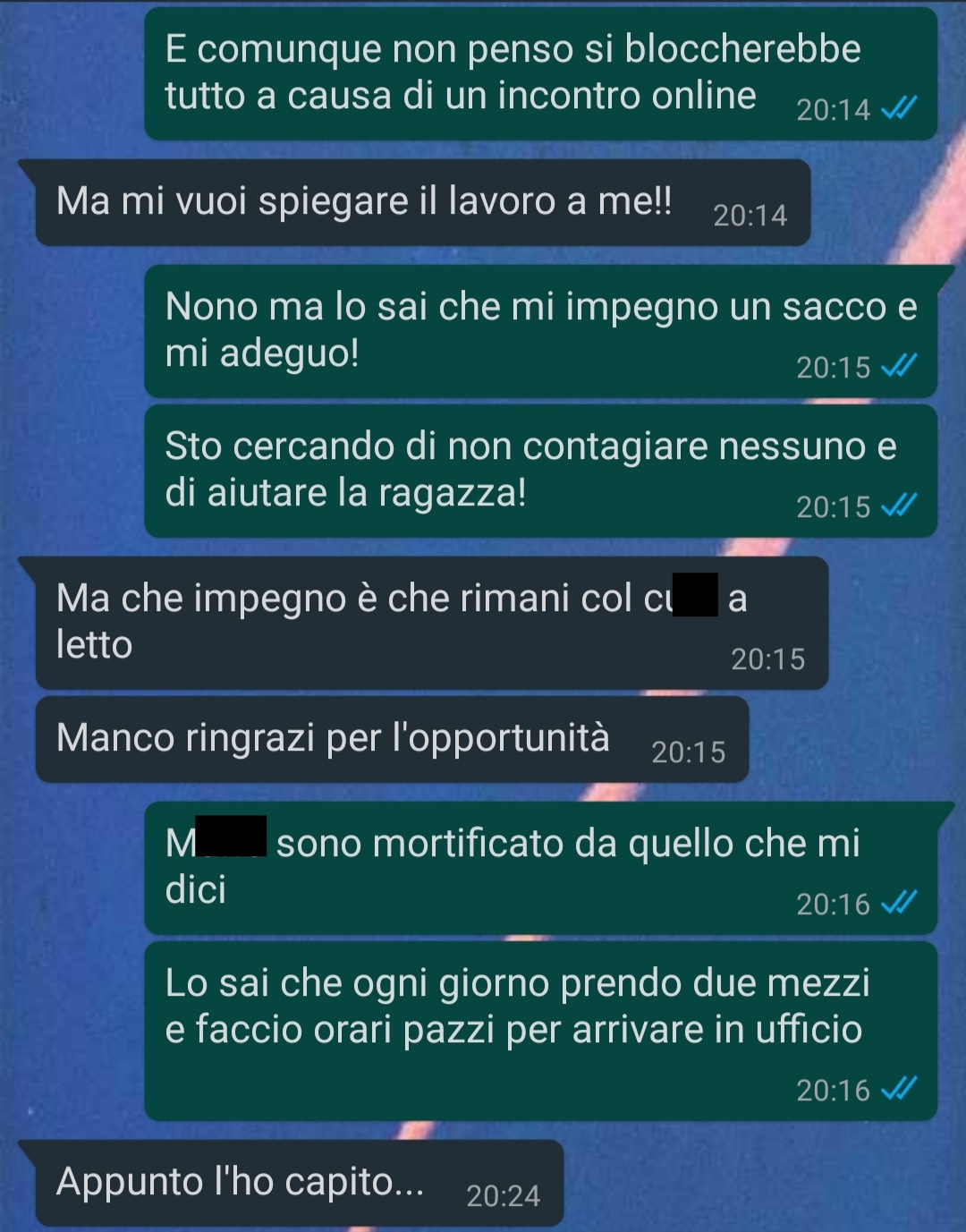 “Alla fine qualche collega sopra di me nelle gerarchie lo avrà fatto ragionare, perché una di loro mi ha chiamato dicendomi di far tutto su zoom e dandomi l’arrivederci alla settimana dopo… ma ovviamente il mio spirito non è più quello supercontento di una volta. Che dovrei fare però, lasciarli per orgoglio e cominciare tutto da capo altrove? T__________T”