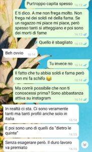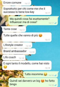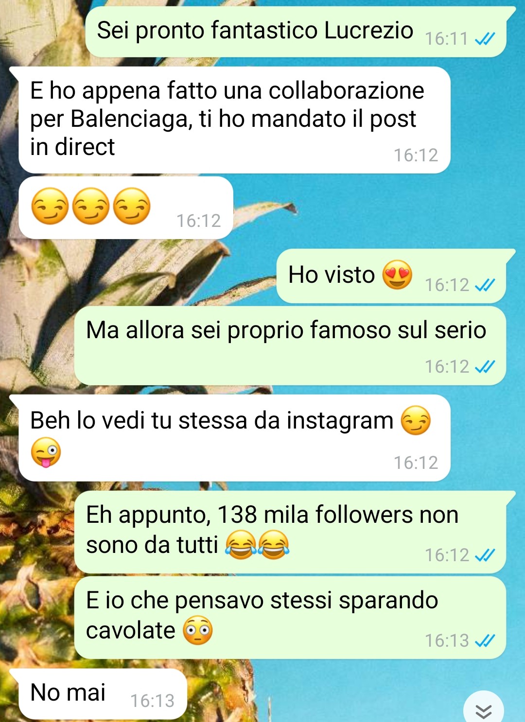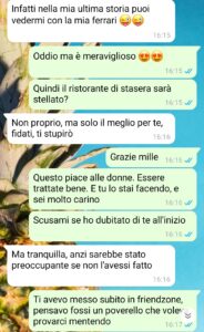 “Dopo qualche anno passato a collezionare delusioni, avevo praticamente messo un muro tra me e chiunque cercasse di impressionarmi con “grandi progetti”, “business milionari” o “collaborazioni internazionali”. Troppi uomini che, all’inizio, sembravano avere il mondo in mano… e che poi si rivelavano per quello che erano: truffa travestita da ambizione. C’è stato quello che diceva di fare trading e viveva ancora con la nonna, quello che aveva “una start-up nel tech” ma stava ancora cercando di capire come si scrive un’email, e quello che giurava di essere un manager e invece lavorava part-time in un call center. Non ho mai cercato qualcuno con i milioni sul conto. Ma vengo da una famiglia che ha costruito tutto con fatica: mio padre ha una cantina di vini molto conosciuta, e mia madre è un’imprenditrice che ha sempre preteso che fossimo indipendenti, ma con dignità. Questo mi ha insegnato una cosa: puoi avere pochi mezzi, ma se hai carattere e sei vero, sei già mille volte meglio di chi si costruisce una maschera per sembrare “qualcuno”. Poi ho conosciuto Lucrezio e tutto finalmente sembrava avere un senso.”