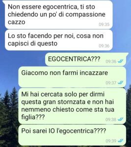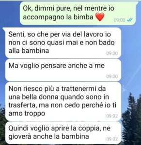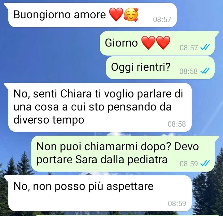 “Ciao a tutte e a tutti. Mi chiamo Chiara e sono la neomamma di Sara, la mia bambina di 9 mesi. Da poco si è beccata una broncopolmonite abbastanza forte, e tra la sua crescita, la sua salute, e la mia stanchezza, il mio compagno Giacomo ha deciso di sganciarmi una bomba, egoisticamente. Mi sono cadute le braccia. Lui fa il camionista, e per alcune settimane al mese non è mai a casa da me e dalla nostra Sara. Mi sento molto sola, ma questo lui ci non pensa, a lui gli frega solo dei suoi bisogni “corporei”. Non so bene che fare, non sono economicamente indipendente, non ho nessuno se non lui, mi sento messa alle strette. Quella che leggerete è solo un parte di quello che è diventata la nostra famiglia. Vi chiedo solo, di essere comprensivi, ne ho bisogno…”