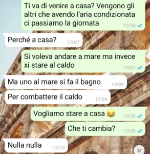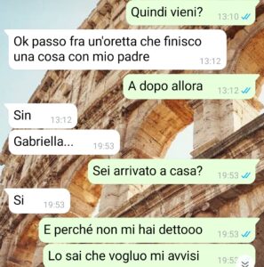 “Ciao, sono Gabriella e sono sicura che la storia che sto per raccontarvi e la chat che leggerete porterà alcune persone a schierarsi con il mio fidanzato, Guido, perché ho già avuto modo di trovare persone tra i miei conoscenti e amici che hanno dimostrato che non ho proprio ragione io. In ogni caso non mi importa di cosa pensano, ma di ciò che penso io e io non sono d’accordo con la sfuriata che mi ha fatto e di cosa mi ha detto. Io e lui stiamo insieme da meno di un anno, questa è la nostra prima estate di coppia e penso che una cosa come quella che è capitata fosse inevitabile a un certo punto. Dovete sapere che lui è un tipo molto composto, educato e compito, uno che davvero starebbe in giacca e cravatta anche con il sole a 90 gradi sopra la testa perché non è consono fare altrimenti. Per carità, per me è follia ma a ognuno le sue manie. Io, invece, sono una molto più alla mano e tranquilla, però sono freddolosa mi capitava in inverno di vestirmi sempre molto coperta e di essere tutta bella carina e sistemata come piace a lui. Non è che mi vorrebbe in burqa eh, ma lui è un amante dell’ordine a ogni costo ed è arrivato il momento per noi di scontrarci su una cosa che proprio non va bene in estate. Come ci si comporta e ci si veste. Perché c’è una cosa specifica di come non mi vesto che lo infastidisce e per me è una cosa veramente normale. Ma c’è molto altro dietro quindi vi lascio alla lettura.”
