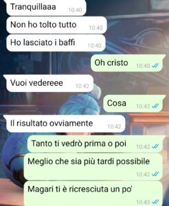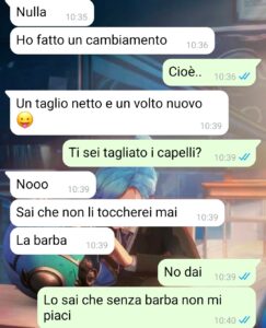 “Ciao a tutti, sono Claudia e voglio parlarvi della difficile relazione che ho con Mario, un ragazzo con il quale di per sé sto benissimo, ma che mi fa impazzire per alcune cose. Non vi dirò cosa, dato che lo scoprirete da soli leggendo gli screenshot della chat che ho avuto con lui di recente, ma vi spiegherò com’è iniziato tutto. Io e lui non stiamo nemmeno insieme da tanto, penso che sia da quasi 6 mesi, che oltretutto mi sembra anche strano che lui non abbia voluto festeggiare dato che è uno che vuole la mezza scusa. Fatto sta che ci siamo conosciuti per amicizie comuni, ci siamo piaciuti subito, ci siamo messi insieme dopo pochissimo che ci sentivamo e ci frequentavamo e tutto sembrava andare bene. Lui è una persona molto altruista, buona, gentile, premurosa, simpatico come pochi. Sa davvero farmi sorridere e mi sento bene con lui.