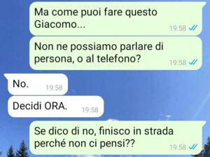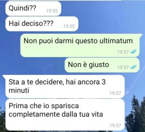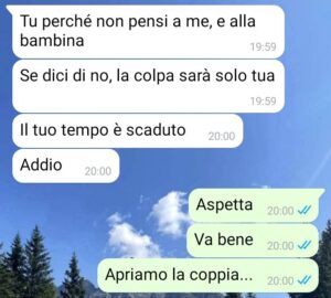 Come avrete ben capito, mi ha dato un ultimatum: aprire la coppia e continuare ad essere mantenuta economicamente da lui oppure essere buttata fuori di casa.