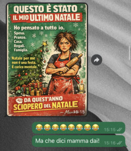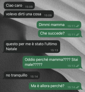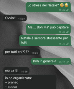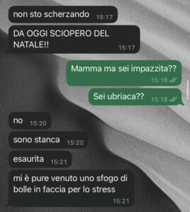 Cioè per farvi capire, ci si è messa pure mia madre!!! Assurdo! Lei, che ha sempre fatto il Natale, da che io mi ricordi… cucinando per tutti, organizzando una bella festa e dei bei regali per tutti e mi è sempre sembrata molto felice! Anche quest’anno ha fatto così, ma il giorno dopo mi ha scritto delle cose assurde.
