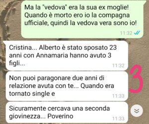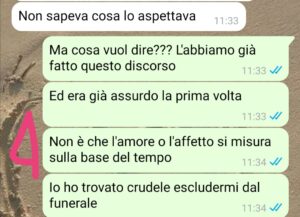 Quando lui è mancato, l’ex moglie e i figli hanno fatto di tutto per cancellare ogni traccia della mia presenza, come se non fossi mai esistita nella sua vita. La cosa più grave in assoluto, è che mi hanno chiesto di NON partecipare al funerale. Mi hanno detto che la cerimonia per l’ultimo saluto era riservata alla famiglia e che io non ero niente. E che avrei dovuto fare un passo indietro soprattutto per i figli che hanno già patito troppo la separazione e la mia presenza. E ora il lutto del proprio padre.