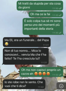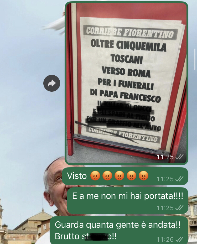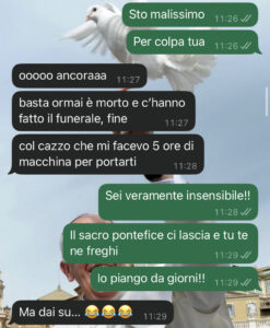 “Ciao a tutti…Fratelli e Sorelle… come saprete il nostro amato e adorato Papa Francesco non c’è più, è volato in cielo. Per me è stato davvero un colpo al cuore. Ho pianto per giorni perché per me è stato una vera e propria guida spirituale e di vita. Avevo un solo desiderio: andare a dargli l’ultimo saluto a Roma il giorno dell’addio. Ho pregato il mio fidanzato in tutti i modi di portarmi a Roma, noi siamo toscani, ma non ne ha voluto sapere. Io purtroppo non riesco a passarci sopra perché mi ha fatto un torto troppo grande. Continuo a stare male, a guardare le foto e i video di quel momento e penso solo a una cosa “io non c’ero” e questo mi ferisce nel profondo. Ne ho parlato con il mio fidanzato e lui ha accampato una serie di scuse, con un atteggiamento che non mi piace per niente, da vero menefreghista. Allora ho dovuto prendere una decisione drastica… Spero che qualcuno dei vostri lettori sia riuscito ad andare e partecipare a questo momento storico fondamentale e importantissimo.”