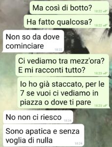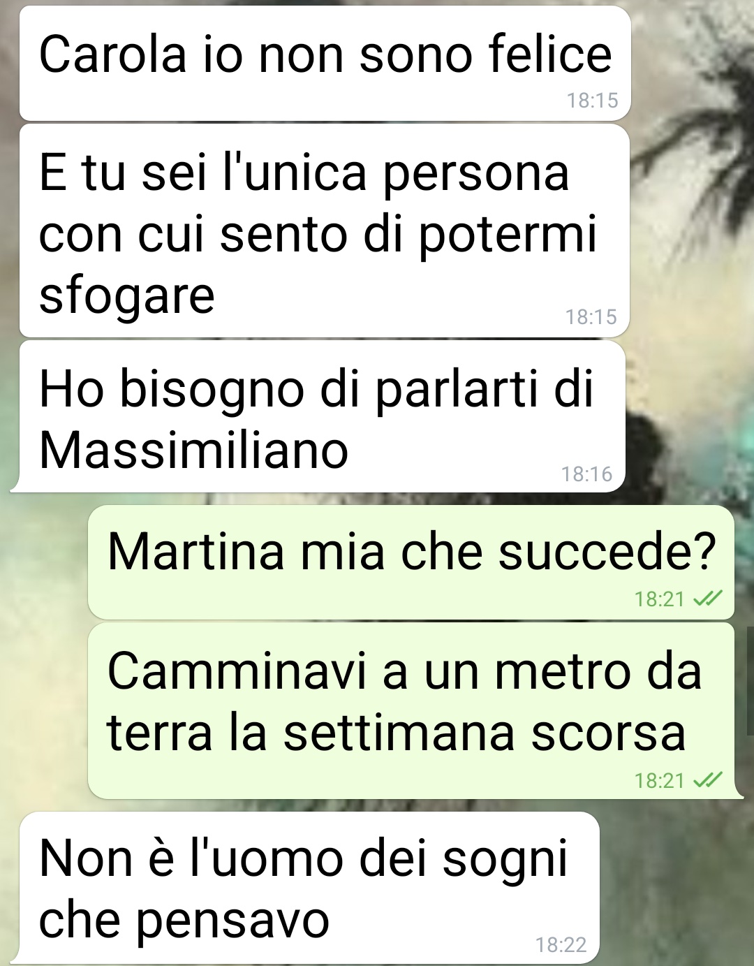 “L’uomo dei sogni può non essere l’uomo dei sogni, anche se in effetti è proprio l’uomo dei sogni… non ci avete capito niente? Nemmeno io e soprattutto non ci ha capito niente la mia amica Martina. Io sono Carola è questi screen li ho fatti adesso dalla conversazione che ho avuto con lei. Mi ha scritto per dirmi del problema con Massimiliano. È il suo nuovo ragazzo, neanche tanto nuovo, che stanno assieme da quasi un anno ormai. Io per le volte che l’ho visto mi è sembrato un ragazzo veramente a posto, di quelli che meritano fiducia. E tutti i “resoconti” di Martina non facevano che confermare ogni volta queste impressioni. Un vero uomo dei sogni, diverso da quello che è stato il target dei suoi ex. Moooolto diverso. E lei, mai vista così felice. Radiosa. Fino alla settima scorsa però. Da quando “pensa e si distrugge”. Da quando cioè ha realizzato una cosa. Una cosa fondamentale. E che ha innescato la sua sofferenza e questa incredibile chat. Ma io come altro devo aiutarla? Ho forse sbagliato?”