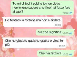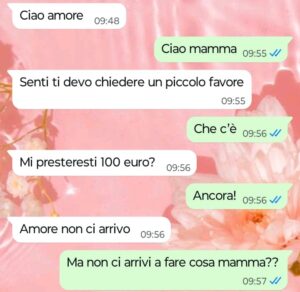 “Carissime Spunte Blu, mi presento il mio nome è Alessandra e sono figlia di una madre persa. Quando è morto mio padre mia madre era andata un po’ in depressione, poi però sembrava essersi ripresa benissimo e infatti l’anno scorso lei si gestiva benissimo da sola in casa, senza bisogno di alcun aiuto e fino a tre mesi fa devo ammettere che è sempre stato così. Da due mesi a questa parte però mia madre ha iniziato a chiedermi dei soldi. Il primo mese io glieli ho dati senza batter ciglio anche se dentro di me ho cominciato a chiedermi perché mai mi avesse chiesto un prestito data l’ottima pensione che prende ogni mese e la casa di proprietà dove vive le permette di non pagare nessun tipo di affitto. Questo mese però – precisamente stamattina – mia madre mi scrive per chiedermi un secondo prestito e lì non ci ho visto più e l’ho subito tampinata di domande per capire che fine avesse fatto fare alla sua pensione. Il resto leggetelo da voi. Io ora sono veramente disperata, la settimana prossima la porterò da uno psicologo perché credo che mia madre abbia ormai sviluppato una dipendenza bella e buona per ridursi a chiedere i soldi a me per fare una spesa e mangiare.”