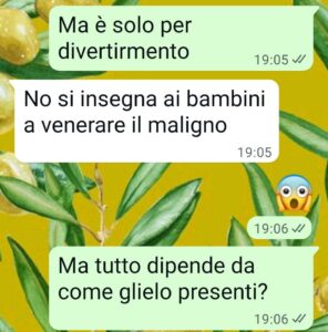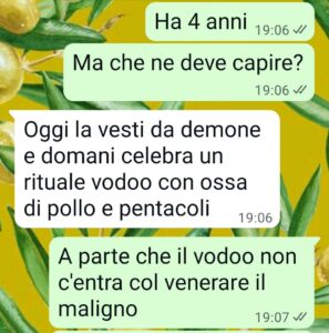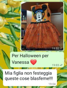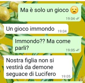 Vi mando la nostra conversazione, perché preghiate per me…. cioè un costumino di hallloween e io divento lo zimbello del paese… help me. vi ho voluto bene.”