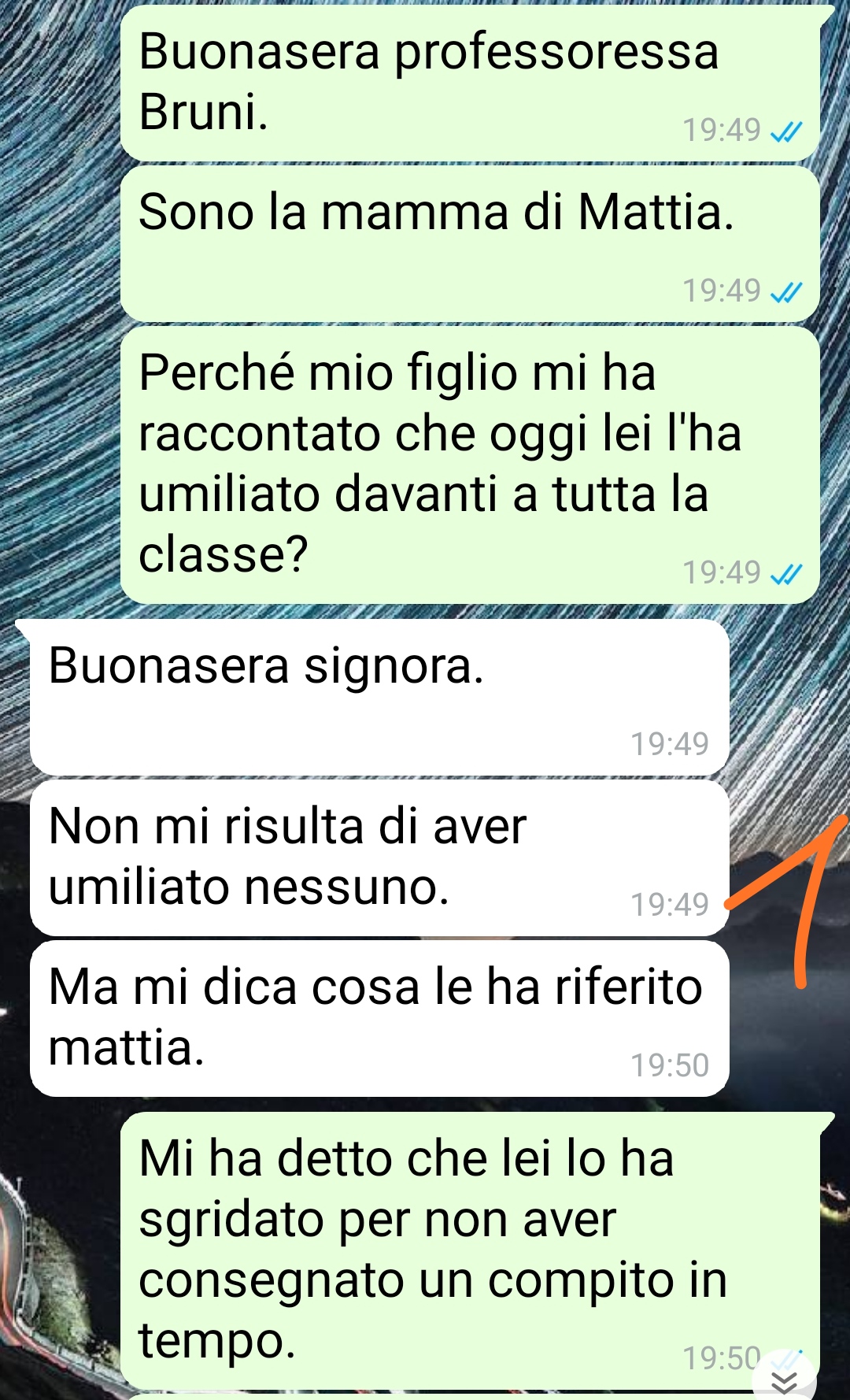 “Non sono il tipo di persona che si intromette spesso nella scuola o nelle questioni dei professori, ma quando Mattia è tornato a casa oggi, ho capito subito che qualcosa non andava. Era arrabbiato, frustrato, e mi ha raccontato di essere stato umiliato davanti a tutta la classe dalla professoressa Bruni. Non potevo crederci. Mattia mi ha detto che stava rispondendo a un messaggio importante, e lei, invece di capire la situazione, lo ha sgridato pubblicamente, accusandolo di distrarsi. Per me, il rispetto verso i nostri figli è fondamentale, e non accetto che qualcuno, neanche un insegnante, possa trattarli male senza motivo. Ho preso subito il telefono e ho scritto alla professoressa per avere spiegazioni. Sono una mamma, e come tutte le mamme, difenderò mio figlio fino alla fine, soprattutto quando so che ha ragione. La conversazione che ne è seguita? Un mix di arroganza e risposte fredde da parte sua. Ma non si preoccupi, professoressa, questa storia non finirà qui.”