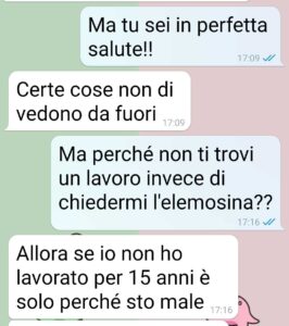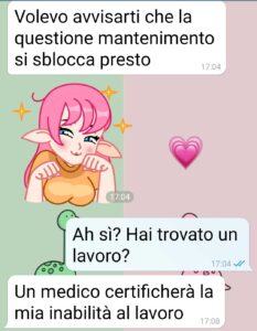Ora mi scrive, con una faccia di bronzo, dicendo che sta pensando di farsi fare i certificati così da non poter lavorare… e così, guarda caso, io dovrei mantenerla a vita.