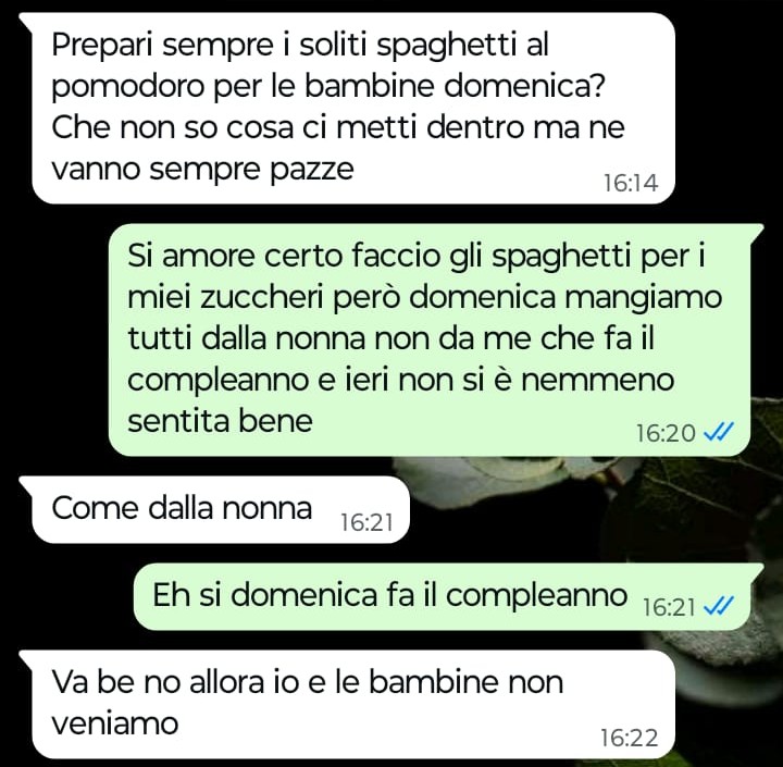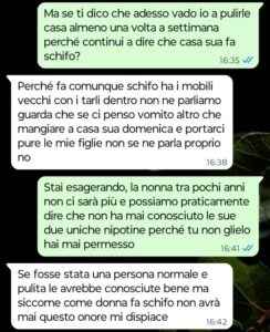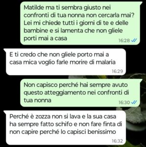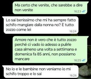 “Buongiorno Spunte Blu, sono una donna con due figli ormai adulti. Con entrambi i miei figli ho un ottimo rapporto ringraziando il cielo, ma questo non significa che non ci siano mai problemi, anzi. Il mio problema più grosso è con mia figlia Matilde che odia sua nonna, ossia la madre di mio marito. Io credo fermamente che si tratti da sempre di un odio del tutto immotivato e sono sicura che la chat che vi ho mandato non farà altro che confermare il mio punto anche a chi vorrà leggere quello che è accaduto oggi pomeriggio a causa della conversazione avuta con mia figlia. Matilde mi scrive chiedendomi se questa domenica preparerò gli spaghetti al pomodoro per le sue due bambine e io le rispondo che questa domenica mangeremo tutti insieme da sua nonna… dopo queste mie parole è scattata nell’immediato la sua reazione negativa e ingiustificata, una reazione che mi lascia sempre l’amaro in bocca perché proprio non capisco. Mia suocera ne soffre moltissimo perché amerebbe passare del tempo con le figlie di Matilde, ovvero con le uniche due nipotine ancora piccole che le restano a quell’età visto che gli altri ormai sono tutti adulti.”
