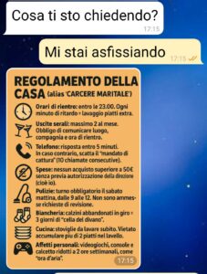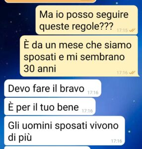 Mi sento in un matri carcere, in caserma. Vi invito a leggere le regole che mi ha imposto. Le cose che mi obbliga a fare. All inizio a me sembrava una cosa divertente. Cioè mi intrigava anche. Ma passati i primi giorni beh ha cominciato ad assumere i tratti dell ossessione e del dispotismo.”