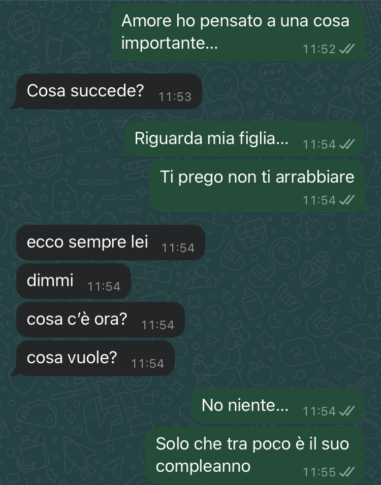 Queste sono le chat tra mio padre e la sua nuova moglie. Io lo so che ho sbagliato, ma l’ultima volta che io e mio padre ci siamo visti ho clonato il suo whatsapp sul mio telefono e ho sbirciato le chat con lei perché avevo bisogno di capire. Guardate cosa dicono di me… Vi condivido questa parte sul mio compleanno perché è quella che mi ha ferita più di tutte le altre.
