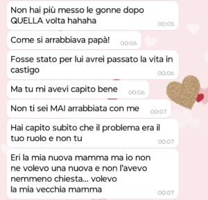 Quando io e Pietro ci siamo conosciuti Giulia aveva 7 anni e aveva perso la madre due anni prima… e ovviamente di una matrigna proprio non ne voleva sapere. Ci ho messo un sacco di tempo a conquistarmi la sua fiducia, per non parlare del suo affetto… ma anche in questo caso ne è valsa la pena! Giulia è esattamente come speravo sarebbe stata mia figlia. Solare, simpatica, intelligente… con tutte i pregi e i difetti che amo di suo padre.
