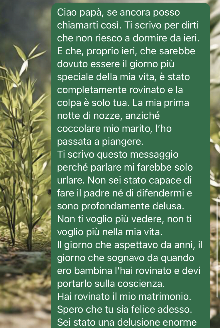 “Ciao lettori e lettrici della pagina, ho bisogno di raccontarvi cos’è successo ieri perché sennò esplodo, ho bisogno di confrontarmi con altre persone e spero di ricevere testimonianze e rassicurazioni. Vi scrivo dall’aeroporto perché sto per partire in luna di miele con mio marito, ma sono tutt’altro che felice. Ci siamo sposati ieri, era un giorno che aspettavo da tutta la vita e lo immaginavo come il giorno più bello della mia vita, una giornata fatta di gioia, amore e serenità. Invece è stato orribile e mi è venuta la gastrite. Il mio giorno speciale, dopo lunghi preparativi durati mesi e tantissimi soldi spesi, è stato rovinato completamente e non riesco a darmi pace, ci sto troppo male! Non mi sarei mai aspettata ciò che è successo perché è stato davvero un colpo basso da chi diceva di amarmi, cioè mio padre. Gli ho scritto stamattina, sperando in delle sue scuse, ma ovviamente ha negato tutto, come fa sempre. Non immaginerete mai ciò che è successo. Sono stata messa in ombra, derisa… il giorno del MIO matrimonio. Che delusione, che tristezza…”