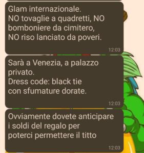 Mo lo dico: ho già visto troppe nozze in agriturismo piene d’amore sincero per farmi fregare da ‘sta favoletta deluxe. Mettimi pure tra gli “esclusi”, ma con dignità.”