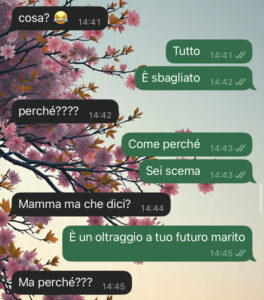 Io sono cresciuta con certi valori, con il rispetto delle tradizioni e dei ruoli. Oggi sembra quasi una parolaccia dire una cosa del genere, ma per me certe regole servono, tengono insieme una famiglia. Servono regole e ordine per far durare la famiglia come una volta!! Invece lei prende tutto come un gioco, come se le tradizioni fossero solo vecchiume da buttare via. Io non sono d’accordo.