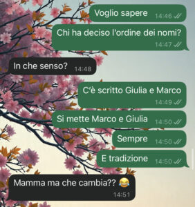 Io sono cresciuta con certi valori, con il rispetto delle tradizioni e dei ruoli. Oggi sembra quasi una parolaccia dire una cosa del genere, ma per me certe regole servono, tengono insieme una famiglia. Servono regole e ordine per far durare la famiglia come una volta!! Invece lei prende tutto come un gioco, come se le tradizioni fossero solo vecchiume da buttare via. Io non sono d’accordo.