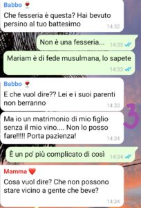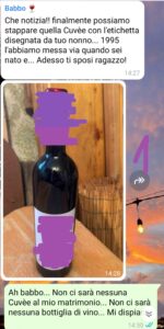 La mia famiglia ne è al corrente, della proposta che intendo farle, così la mattina dopo chiamo mia madre e tutto soddisfatto posso dirle che Mariam ha detto sì!! La telefonata si conclude così. Mamma dice che andrà a dirlo a papà. Lui tutto contento, poco dopo scrive sul gruppo che abbiamo io, lui e mamma, che finalmente per il mio matrimonio potremo stappare la riserva di vino del mio anno di nascita. Dovete sapere, e questo è un particolare importante, che da quattro generazioni la mia famiglia possiede un’azienda vitivinicola. Quindi il vino per noi è sempre stato tutto.