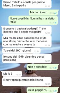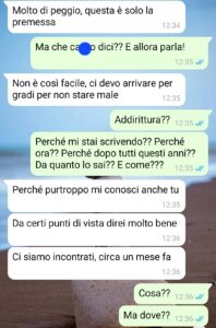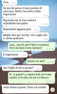 “Non ho mai avuto un grande rapporto con mio padre. È sempre stato uno di quelli che si fanno vedere solo quando c’è da fare bella figura: le cene di Natale, le foto con la famiglia felice per Facebook (perlomeno fino alla separazione ufficiosa con mamma), e poi puff, spariva per settimane. Da piccolo ci soffrivo, poi ho iniziato a fregarmene. Cresci, ti abitui. Ti convinci che certe cose non le cambi. L’unica cosa che mi ha lasciato davvero è il suo cognome… e forse un vago senso di diffidenza verso chi dice di “volerti bene”. Ora vive con noi, facciamo la parte della famiglia felice nonostante tutto, però non è mai stato davvero e così. E a prescindere da tutto questo, non lo sarà più per il resto dei miei giorni, dopo quello che è accaduto. Era un giorno come un altro e dal nulla vengo contattato da questa ragazza su WhatsApp. Non la conoscevo (almeno così credevo inizialmente) non avevo il suo numero e quindi l’unica cosa che volevo fare, temendo una truffa o peggio, era tagliare corto e chiudere la conversazione il prima possibile. Non è stato possibile però, perché quello che mi ha scritto mi ha scombinato l’esistenza.”