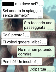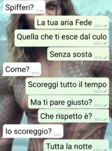 Questa è la chat che ho avuto con Federico il 4 giorno della nostra vacanza. Ci stiamo frequentando assiduamente da qualche mesetto, e la settimana scorsa abbiamo trascorso una settimana con altre 3 coppie “rodate” in una villetta località mare. È stata la prima occasione per dormire (dormire nel senso stretto del termine) insieme e insieme risvegliarci al mattino. Vedere insomma se ci sono i presupposti per una cosa seria davvero. Ma io dopo questa vicenda ho rallentato. Perché a parte la spiacevolezza della cosa, disgustosa davvero, quello che mi fa incazzare è questa autodifesa all’estremo del torto. Perché gli uomini devono sempre per forza cadere in piedi? Non è mai colpa loro. Per lui io dovrei bermi che uno peta tutte le sante ore di tutte le sante notti senza accorgersene. Glielo dite pure voi che così si gioca la mia fiducia e ogni chance?”