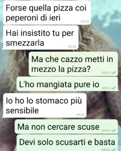 Questa è la chat che ho avuto con Federico il 4 giorno della nostra vacanza. Ci stiamo frequentando assiduamente da qualche mesetto, e la settimana scorsa abbiamo trascorso una settimana con altre 3 coppie “rodate” in una villetta località mare. È stata la prima occasione per dormire (dormire nel senso stretto del termine) insieme e insieme risvegliarci al mattino. Vedere insomma se ci sono i presupposti per una cosa seria davvero. Ma io dopo questa vicenda ho rallentato. Perché a parte la spiacevolezza della cosa, disgustosa davvero, quello che mi fa incazzare è questa autodifesa all’estremo del torto. Perché gli uomini devono sempre per forza cadere in piedi? Non è mai colpa loro. Per lui io dovrei bermi che uno peta tutte le sante ore di tutte le sante notti senza accorgersene. Glielo dite pure voi che così si gioca la mia fiducia e ogni chance?”