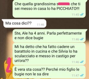 “Salve, sono una mamma giovane e separata e ho un bellissimo bambino di 4 anni. Sapete la cosa che mi ha lasciato più perplessa quando mi sono separata quale è stata?? Che un giorno avrei dovuto, in qualche modo, condividere la mia maternità con un’altra donna. E non prendetela solo per gelosia, ma la mia era proprio preoccupazione. Cosa sarebbe successo se questa donna non fosse stata in grado di prendersi cura di mio figlio?? Purtroppo queste paure sono condivise tra chi è separato, ma non credevo che avrei dovuto affrontarle così in fretta. E invece…il mio ex si è rifatto una vita molto velocemente (molti uomini non sanno stare soli) e così sono venuta a sapere direttamente da mio figlio che durante i weekend che passa dal padre c’è la sua nuova compagna. E vi assicuro che non è questo il problema. Il problema è nato quando mio figlio, che ha 4 anni e quindi parla perfettamente, mi viene a raccontare una cosa che mi fa gelare il sangue… Ora chiedo a tutte le mamme, ma pure ai papà della community…(ma anche a chi non è genitore eh…)secondo voi sono esagerata io o è giusto prendere un provvedimento in merito e fare qualcosa???”