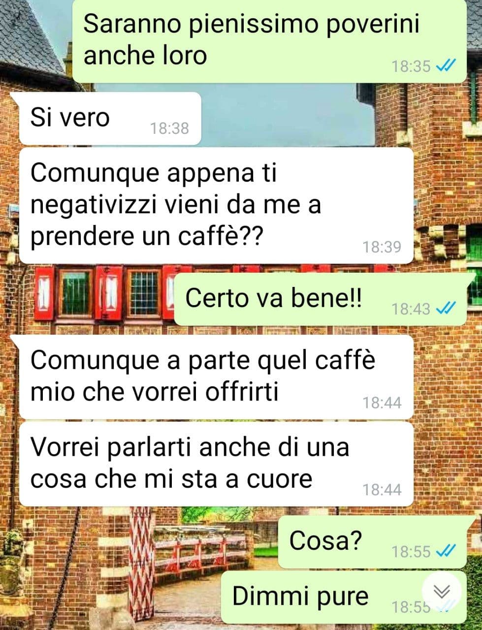 In questo periodo io purtroppo sono risultata positiva (come penso anche molti di voi, siamo circondati!) E quindi ho svolto la quarantena nella mia camera… Gentilmente lui in questi giorni si è fatto sentire, e parlando, sono venuta a sapere una cosa che mi ha abbastanza messo in imbarazzo…alla fine ho dovuto contattare la sua ragazza…”