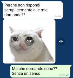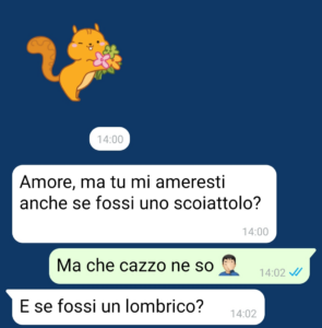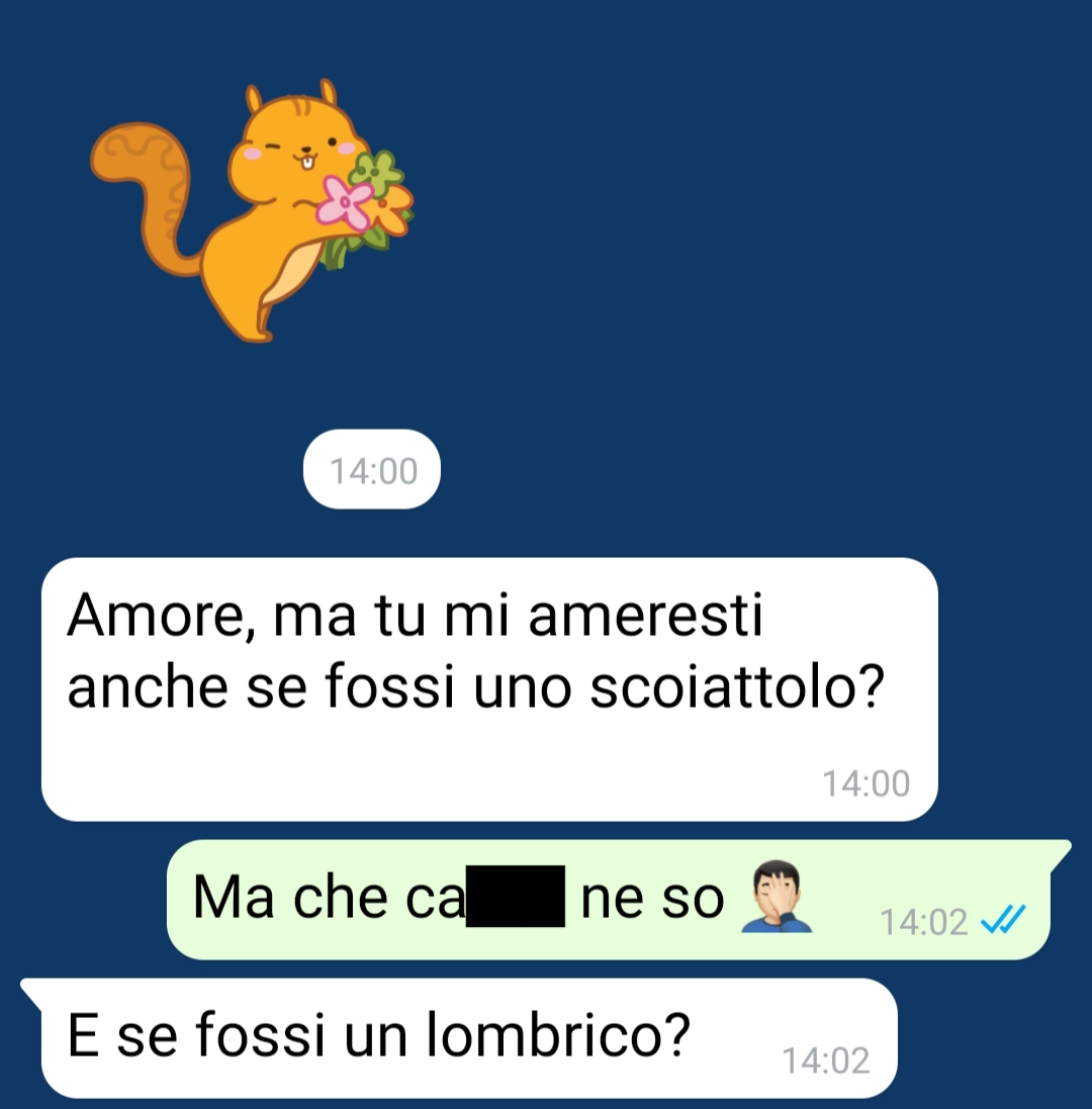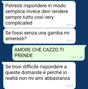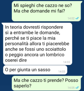 “Ciao, mi chiamo Manuel e sono fidanzato con Giorgia da un annetto. Lei è carina, simpatica ma tutto sommato una tipa nella media che non mi crea troppi problemi. Il suo principale difetto è però la sua immensa insicurezza. Non so davvero come farle capire che non si può continuare così e che è importante essere un attimo sicuri di sé per avere anche una bella relazione con gli altri. E niente. Quindi ho iniziato a riflettere sul nostro rapporto e su come sarebbe la mia vita senza di lei o con una tipa diversa. Non so, voi siete mai state così insicure? Oppure avete mai avuto delle fidanzate così insicure? Non so proprio che pesci pigliare…”.