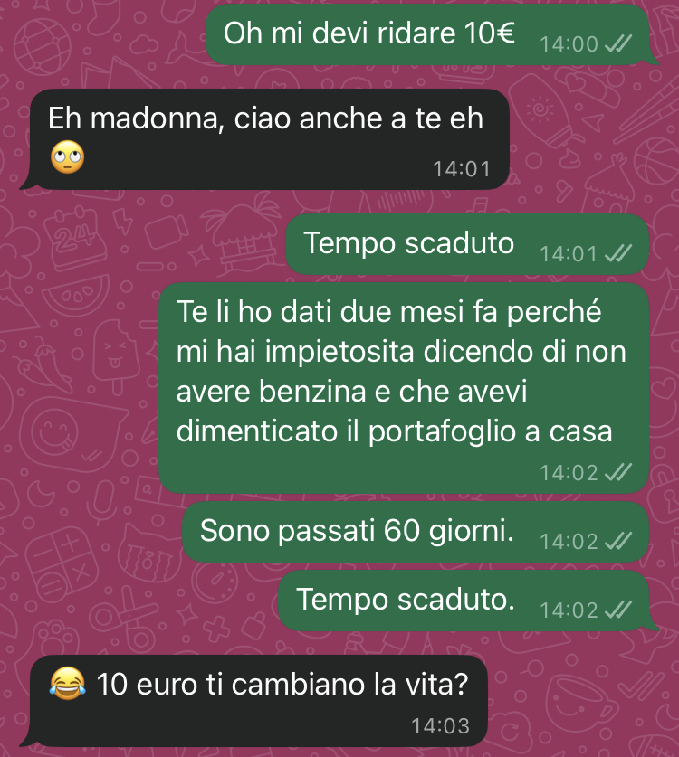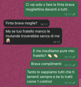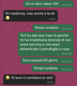 “Ciao a tutti quanti voi della pagina….. mi servono consigli. Ho dei seri problemi con mia cognata perché non mi vuole ridare 10 euro che le ho gentilmente prestato. Io provo a sopportarla perché è la moglie d mio fratello, ma così no… non va più bene. Sto letteralmente perdendo la pazienza. Premessa: io cerco sempre di mordermi la lingua, perché in fondo lei è la moglie di mio fratello e per quieto vivere uno prova a ingoiare, a lasciar correre, a farsi scivolare addosso tante cose. Ma c’è un limite.