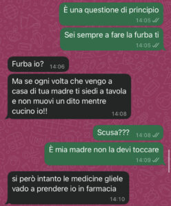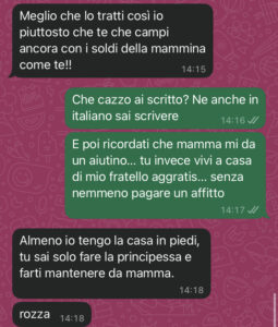 Io non sono certo una santa, ma quando vedi qualcuno che si approfitta, che non ti riconosce neanche il minimo, la goccia poi fa traboccare il vaso. E credetemi: il vaso era già pieno da un bel po’. Le ho chiesto i soldi e ha iniziato a dire cose assurde… ma vi sembra normale? Mio fratello mi ha detto che non si vuole mettere in mezzo!!!