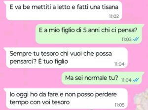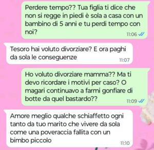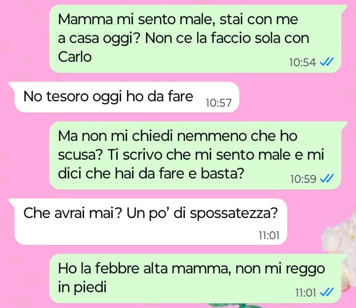 “Ciao Spunte Blu sono una mamma single con un bimbo di 5 anni in casa. Ho divorziato da mio marito perché era un uomo che usava violenza. Adesso vivo per conto mio con mio figlio e i miei genitori vivono a pochi isolati da casa mia. Stamattina ho contattato mia madre perché non mi sentivo bene, ho ancora la febbre alta e quindi da sola con un bimbo piccolo in casa necessitavo di un aiuto naturalmente. Leggete però in che modo ha risposto mia madre alla mia richiesta di aiuto. E fortuna che ho entrambi i genitori ancora giovani e magari ci si potrebbe aspettare una maggiore empatia e comprensione nei miei confronti. La verità però è che ho una madre incommentabile e pessima e basterebbe leggere la semplice chat che ho mandato per capire di che donna vergognosa si tratta”
