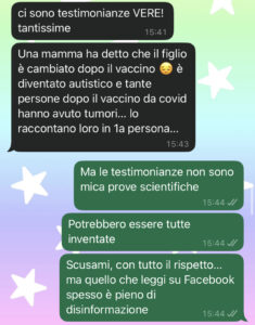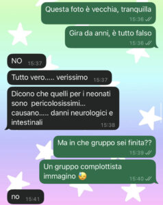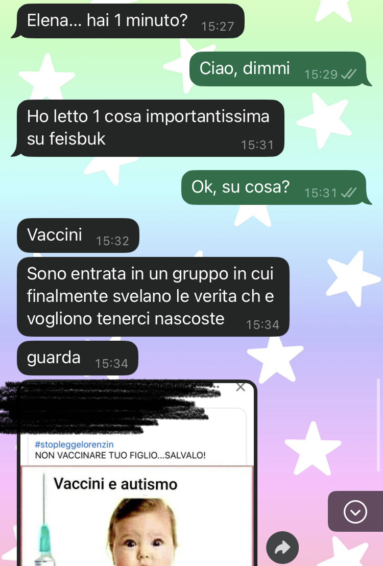 “Ciao scusatemi… vorrei farvi leggere questa chat con mia suocera perché sono sull’orlo dell’esaurimento per colpa sua. Non avevo mai creduto a tutte quelle storie sulla “suocera invadente”, pensavo fossero un po’ leggende metropolitane, invece, purtroppo devo ammettere che è la verità… Mia suocera era abbastanza tranquilla fino a quando non è nato mio figlio, che è anche suo nipote, ovviamente. Ha iniziato a inondarmi di consigli non richiesti e ha tutte delle sue teorie strane su come crescere i figli che nemmeno vi sto a dire… Però l’altro giorno ha oltrepassato ogni limite. Dice di essere entrata in un gruppo su facebook dove smascherano “la verità” sulla scienza, i complotti, il mondo… Tutte cavolate. Fino a quando non ha osato dire che non devo permettermi di vaccinare mio figlio perché è pericolosissimo, e ha avanzato delle tesi assurde… Poi mi ha chiamata tutto il giorno per parlare e non ho mai risposto. Stamattina è venuta a casa e si è attaccata al campanello perché vuole impedirci di vaccinare nostro figlio. Mio marito è troppo buono e non riesce ad essere duro con sua madre per allontanarla… che devo fare aiuto…”