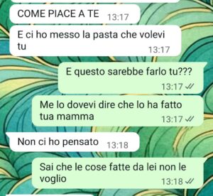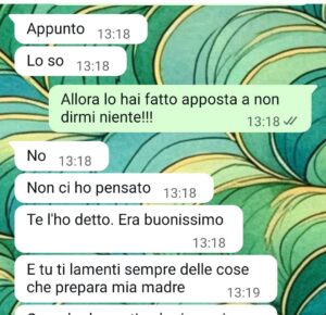“Ciao amici di spunte. Vi scrivo per mandarvi una chat con mio marito. Sua madre cucina spesso per noi ma io nn voglio mangiare quello che prepara. Ma mio marito non capisce perché.