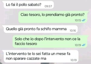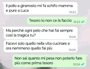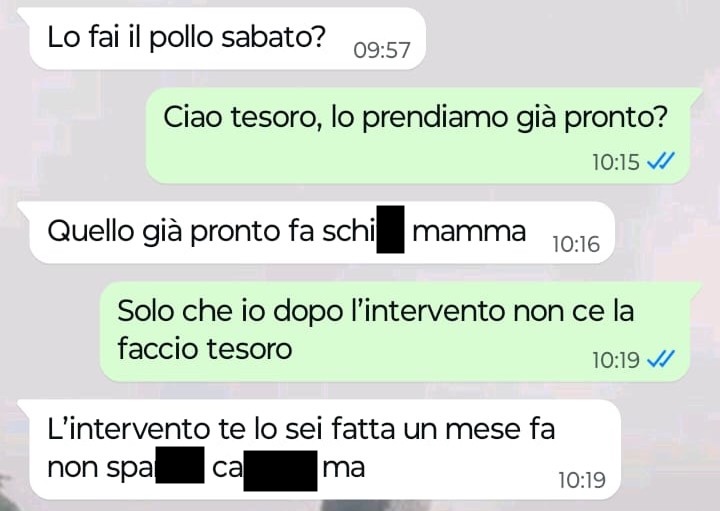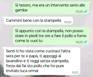 “Carissime Spunte Blu, sono una vostra grande sostenitrice ma oggi vi scrivo con un grosso peso sul cuore. Sono una professoressa da poco in pensione e un mese fa ho dovuto affrontare un intervento importante alle gambe, infatti ancora oggi, dopo un mese esatto, giro per casa zoppicante con la stampella. Poteva andare anche peggio certo, e i medici hanno detto che i miei tempi di ripresa sono eccellenti. Ho un figlio, Vittorio, che amo molto naturalmente. Oggi ci siamo sentiti perché Vittorio mi ha fatto una richiesta specifica per il pranzo del sabato che di solito facciamo sempre tutti insieme a casa anche con la sua compagna, io ho risposto ai suoi messaggi cercando di spiegargli che ora le cose per me sono cambiate dopo l’intervento e purtroppo non sono più quella di prima che sfrecciava per casa come un fulmine; mio figlio però oggi mi ha delusa moltissimo perché non mi aspettavo che potesse avere delle reazioni di questo tipo con me di fronte ad un problema di salute serio, ma è stata sopratutto la soluzione finale che lui avrebbe trovato per il pranzo del sabato a ferirmi come non mai.”