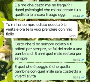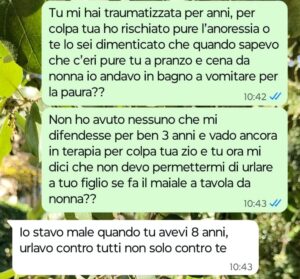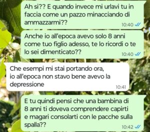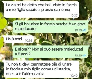 “Ciao Spunte Blu, mi chiamo Luna e sono qui a raccontarvi la mia storia che troverete riassunta in sintesi nella chat che ho deciso di inviarvi oggi. Sono nata e cresciuta senza genitori visto che mia madre è morta di parto e mio padre ha pensato bene di andarsene con un’altra mollandomi a mia nonna materna. Sono quindi cresciuta con mia nonna e con mio zio, ovvero il fratello di mia madre. Mio zio da giovane ha avuto un esaurimento e io ne ho pagato le conseguenze, credetemi ho pagato conseguenze gravissime (anche se lui non mi ha mai messo le mani addosso), conseguenze che affronto ancora oggi in terapia con il mio psicoanalista. Comunque dopo l’esaurimento mio zio si è ripreso del tutto e si è fatto una famiglia, andandosene finalmente via da casa di mia nonna, casa dove però torna sempre con la sua famiglia ogni sabato a pranzo. Lui ora ha un figlio di 8 anni che è un vero pestifero maleducato e sabato a pranzo da nonna ha fatto il pazzo a tavola con tutti. Oggi mio zio mi scrive per rimproverarmi, anzi minacciarmi, rispetto a quello che è successo con suo figlio a pranzo da nonna sabato (pranzo a cui mio zio non era presente). Leggete e giudicate da voi, io sono stata fin troppo paziente con questa persona che mi ha praticamente rovinato la vita, perché i traumi che lui mi ha creato a 8 anni me li porterò dietro per sempre. Ora io non lo voglio più vedere in vita mia e di questo ne parlerò di sicuro con mia nonna.”