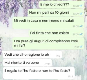 Qualche giorno fa è stato il mio compleanno, ne ho fatti 26, ed eravamo in lite. Speravo che per il mio compleanno Fabrizio tornasse normale… ma non è stato così. Quello che è successo però mi ha proprio aperto gli occhi. Ci ho messo molto, troppo forse… però meglio tardi che mai.”