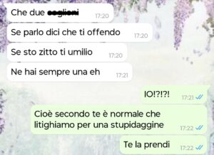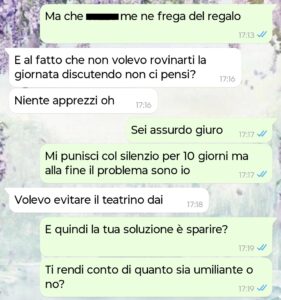 La persona che mi ha mancato di rispetto per ben due anni si chiama Fabrizio, il mio ragazzo. Lui è cresciuto in una famiglia molto diversa dalla mia: i suoi non andavano molto d’accordo, ma soprattutto non sapevano comunicare. Ogni volta che i suoi litigavano, suo padre si chiudeva in un silenzio che poteva durare anche settimane. E Fabrizio ha ereditato questo tratto.