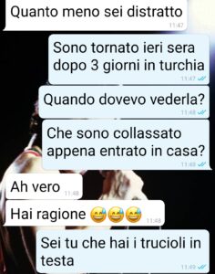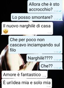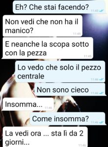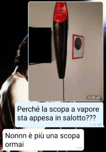 “Volevo solo godermi un po’ di tv in salotto. Da solo, dopo essermi svegliato tardi e pronto a prepararmi il pranzo in santa pace da lì a breve. Che Tiziana è fuori per commesse con sua madre (e pranzerà fuori come sempre). Mi merito un po’ di relax dopo 3 giorni di lavoro in Turchia, una emergenza in piena regola di 13 ore al giorno no stop. E invece… invece quasi mi spiano sul tavolino di vetro. Ho inciampato in un filo elettrico per terra. Quello della scopa a vapore. Che però non è appoggiata al muro dopo una pulizia di pavimento. No no. È appesa al soffitto. Monca di parti. E ancorata ad un tassello! Che diavolo sta combinando Tiziana? Le scrivo subito per spiegazioni. Comincia così questa chat di cui vi mando gli screen. La chat con un genio dell’inventiva. Sto con Leonardo da Vinci e non lo sapevo! Io rimango fedele alla mia risposta numero 2: scriteriata!”
