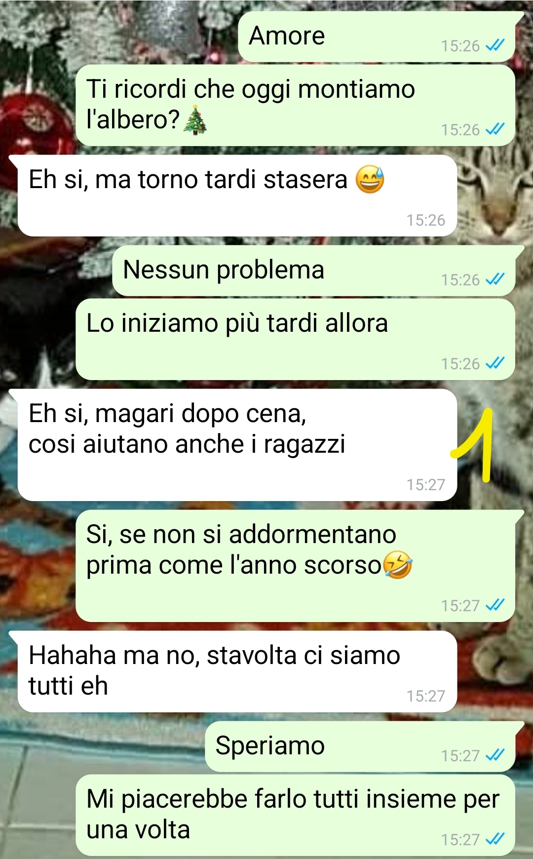 “Non so se capita anche a voi, ma a volte mi sento più una colf che una moglie. Oggi ho fatto l’albero di Natale in anticipo, come ogni anno. Avevo chiesto a Paolo e ai ragazzi di aiutarmi, niente di speciale, solo un’ora insieme, un po’ di musica, le lucine, l’atmosfera giusta per creare la magia del natale che a me piace particolarmente. Mi hanno detto tutti “dopo”. Dopo la partita, dopo la doccia, dopo il lavoro. Solo che quel “dopo” non arriva mai. Così ho iniziato da sola, come sempre. Quando hanno visto che l’albero era già finito, mi hanno pure preso in giro: “eh ma tu non sai aspettare”. Già, non so aspettare. Non so più aspettare attenzioni, gesti, presenze. È solo un albero, direte voi, ma non lo è. È la prova che quando qualcosa mi fa stare bene, devo farla da sola. Eppure io ci credo ancora, a certe piccole cose. A quel “insieme” che ormai sembra una parola da calendario dell’Avvento. Ma tranquilli, anche quest’anno l’albero è venuto bellissimo. Solo un po’ più vuoto del solito.”