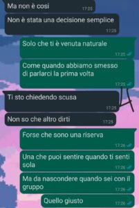 Ma la verità è che ci sono cose che non si sistemano con un “non era mia intenzione”. E che sentirsi dire “non volevo ferirti” dopo che sei stata esclusa, fa solo più male. Questa è la nostra conversazione, cruda e reale, tra amiche che si sono perse e forse, chissà, provano a ritrovarsi. Oppure no. E non so neanche se sia giusto ritrovarsi. Voi cosa avreste fatto?”