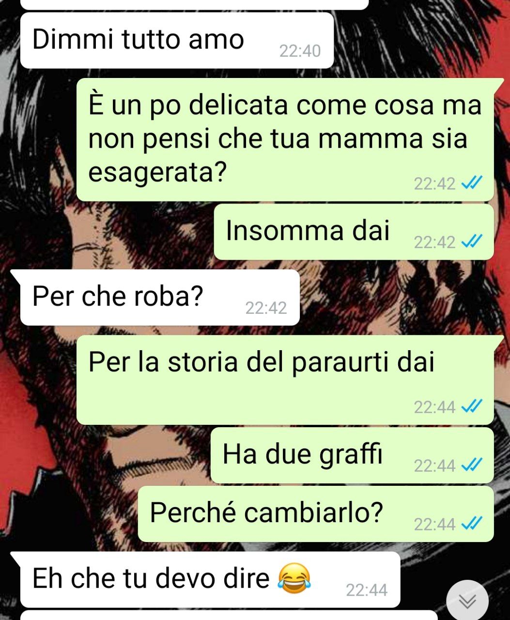 Tutto è nato pochi giorni fa, quando la mamma della mia ragazza ha deciso di voler fare riparare il paraurti, non era rotto, aveva solo qualche graffio, diciamo che il suo era un semplice vizio per spendere soldi dato che ne ha la mania.